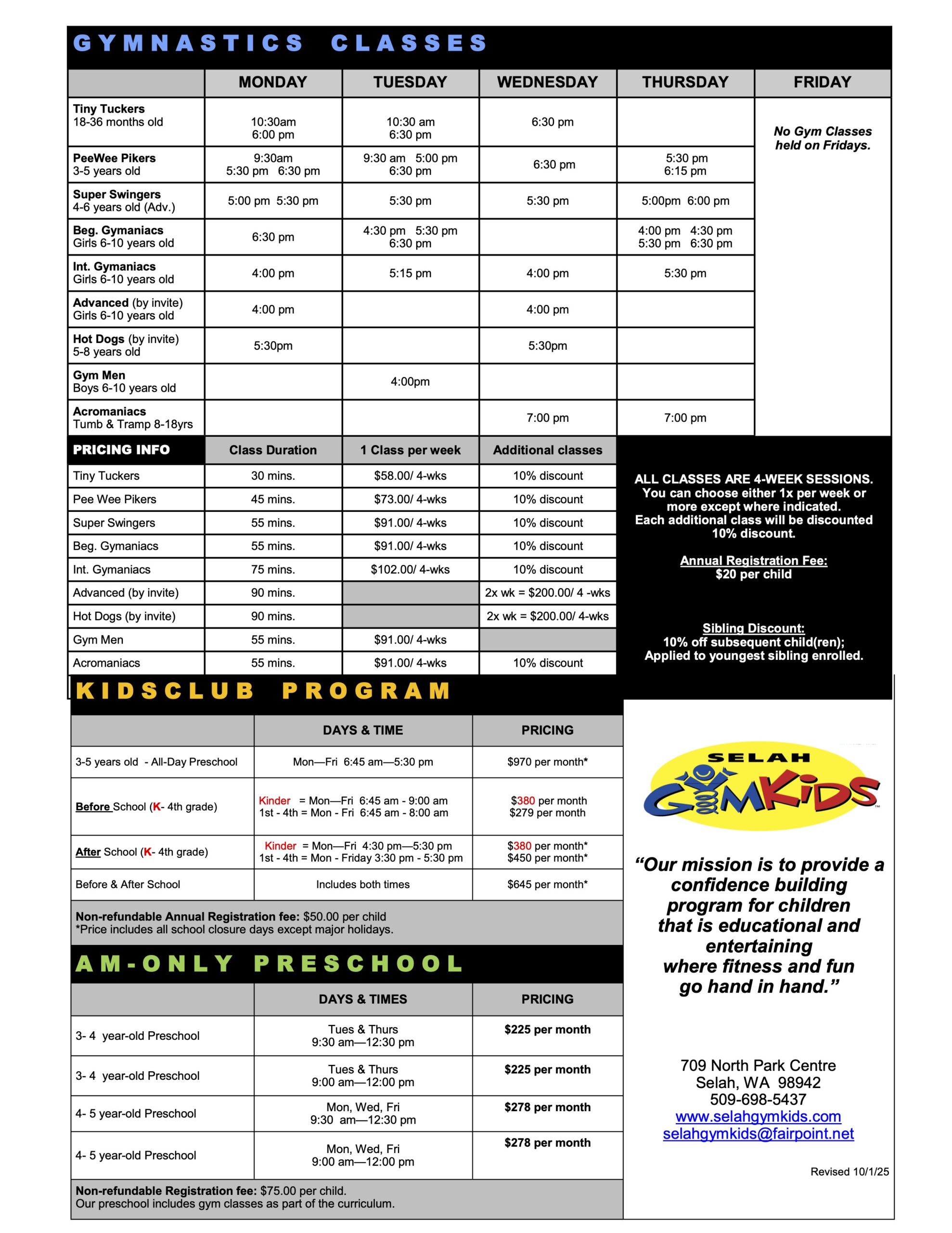 We’re sure your child will flip for our gymnastics program at Selah GymKids of Selah, WA. Call 509-698-5437 to sign up for classes and to ask about our family discounts